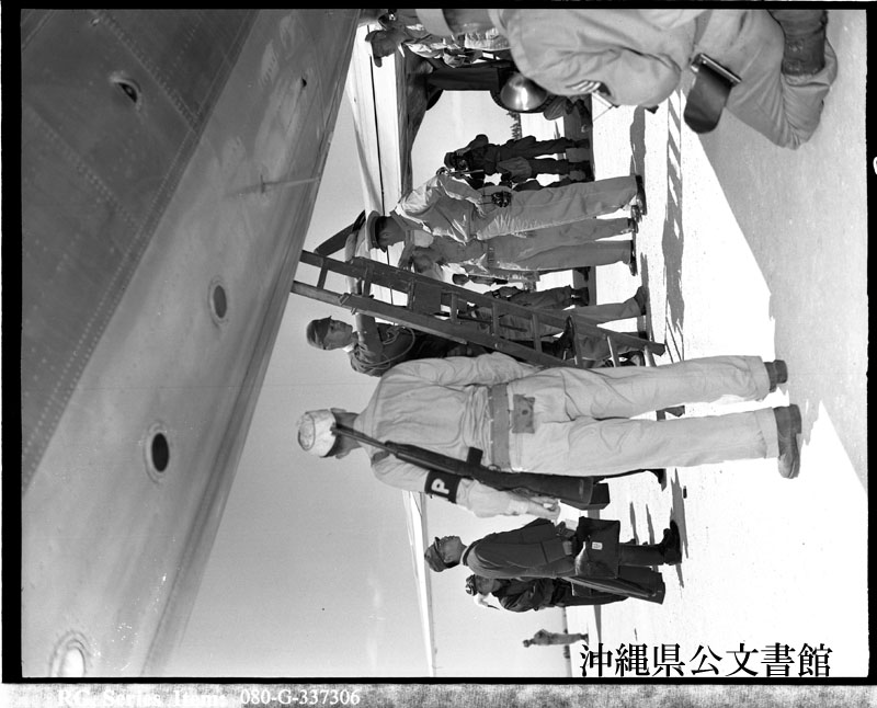 【和訳】 日本軍の爆撃機2機で伊江島飛行場に到着後、C-54輸送機に搭乗している日本側使節団。彼らは、マッカーサー元帥の司令部で降伏条項について話し合うために、フィリピンのマニラに向かう途中である。