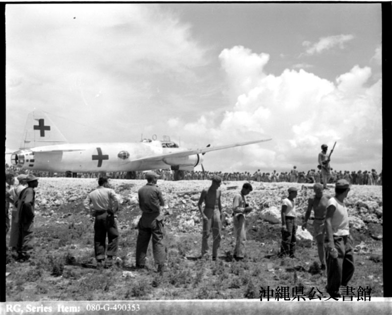【和訳】 伊江島飛行場に到着する日本軍一式陸上攻撃機。マッカーサー元帥と会談する日本側使節団を乗せて、日本本土からフィリピンのマニラへ向かう途中。