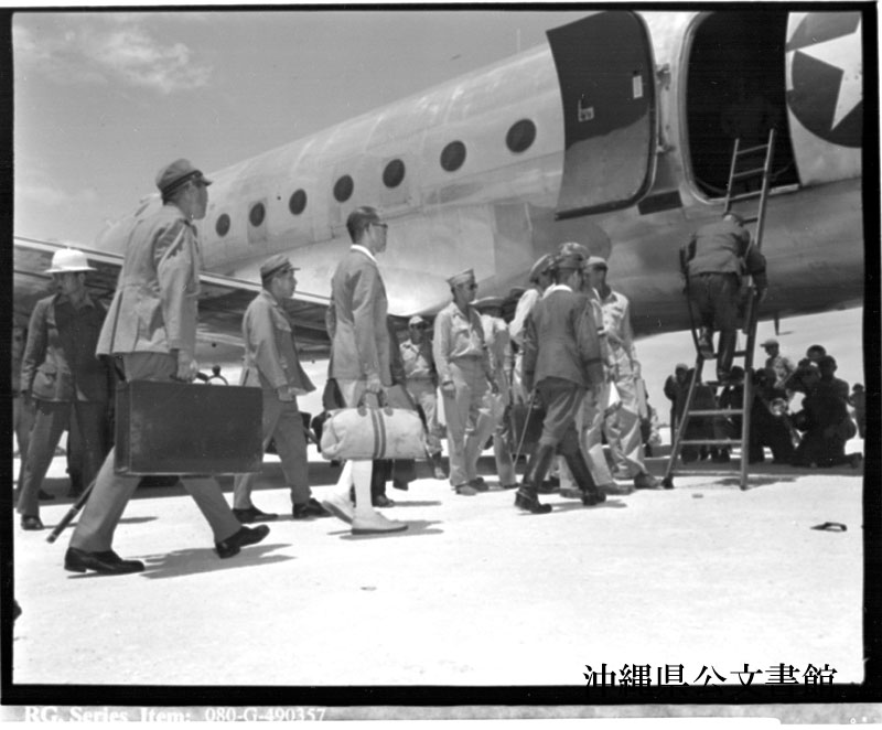 【和訳】 伊江島でC-54輸送機のはしごを登る日本側使節団。使節たちはこれから、同機に搭乗し、マッカーサー元帥との会談のため、最終目的地であるフィリピンのマニラに向かう。