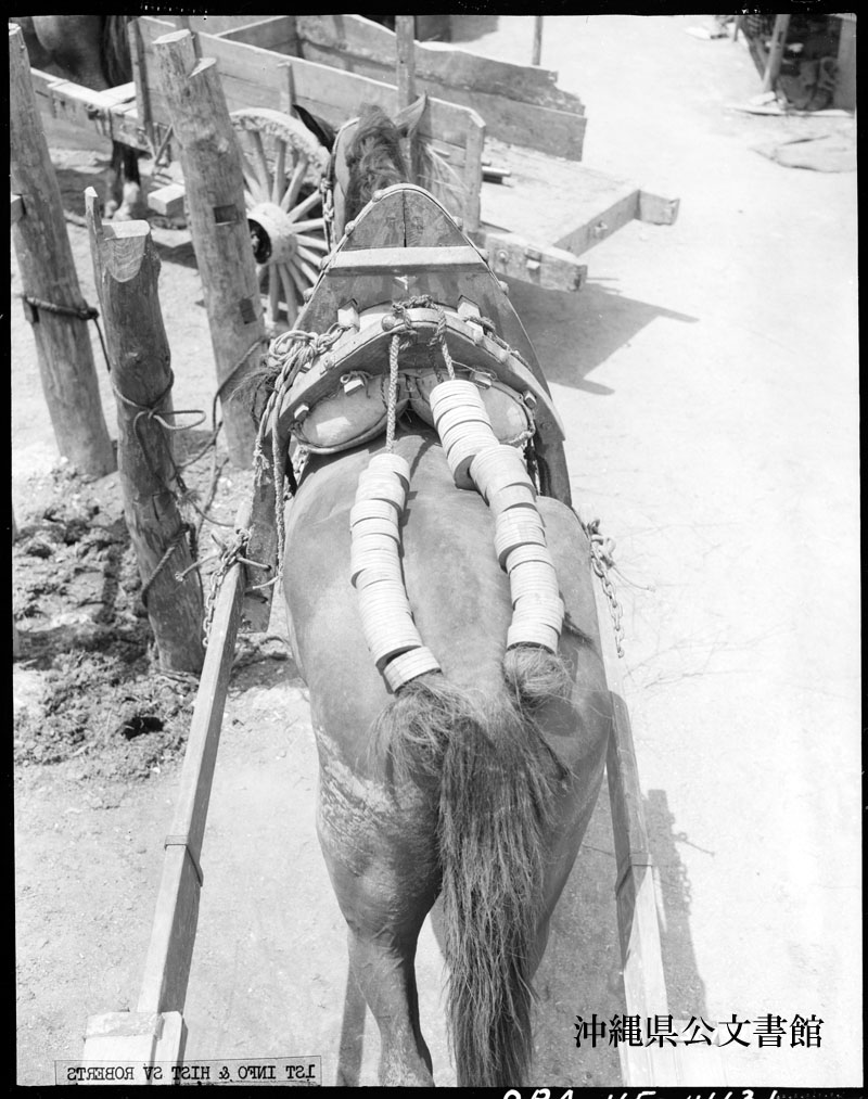 【和訳】 沖縄の地元住民によって使われていた堅い木製馬具は米軍によって取り替えられた。この種の馬具は馬に苦痛を与える。