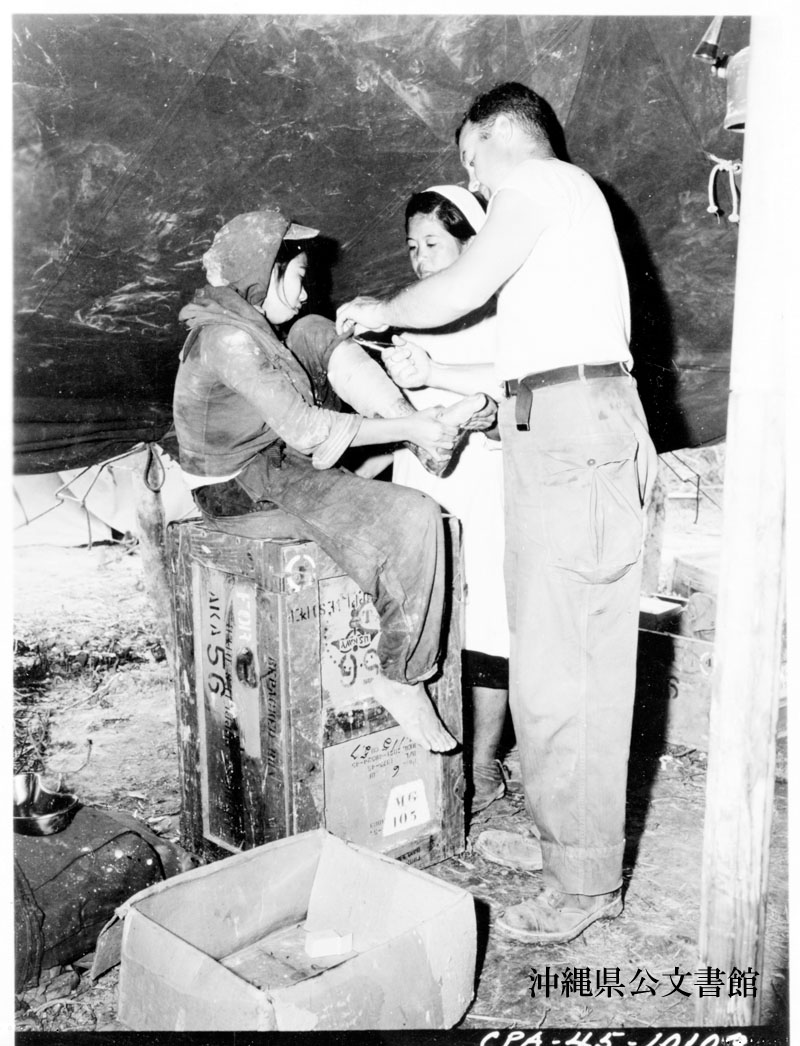 【和訳】 アメリカの前線の後方で沖縄の少女の傷の手当をする海軍医エドワード中尉。住民ボランティアが助手を務める。
