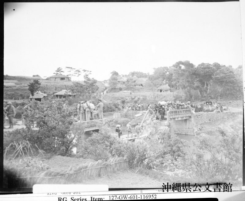 【和訳】 天願川にかかる爆破された橋をわたる住民に手を貸す第5連隊の海兵隊員