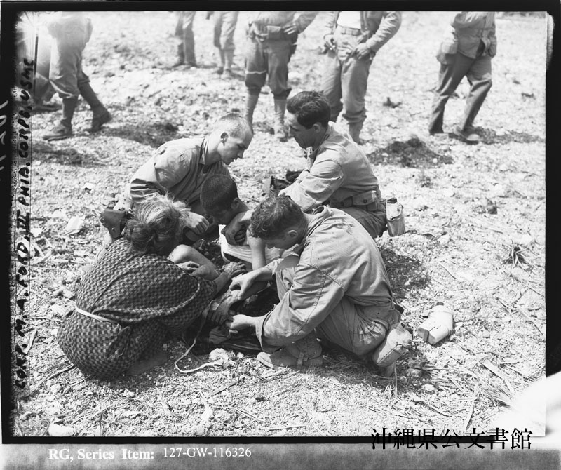 【和訳】 この戦闘で初めて保護された沖縄住民のうち1人を手当する2人の海軍衛生兵。彼等は海兵隊突撃部隊と共に(この)浜にやって来た