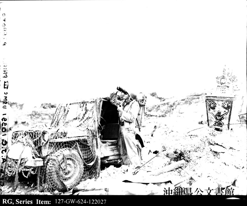 【和訳】 カークマン一等兵。右側に人骨の納められた甕[厨子甕]と沖縄住民の遺骸。住民は収入の殆んどを墓の建立につぎ込む