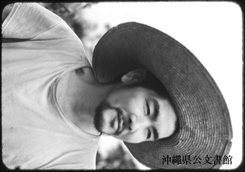 【和訳】 島司令部収容所にいる沖縄の漁師。サトウキビの葉で作った手編みの帽子。素朴で親しみやすい人である。