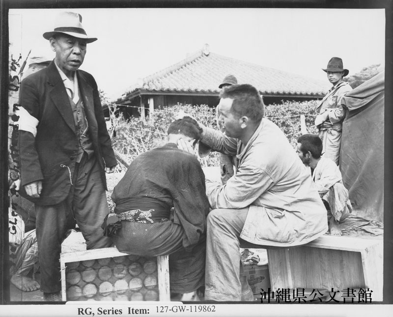 【和訳】 収容所で、沖縄人男性を対象に薬剤師助手による検診が行われている