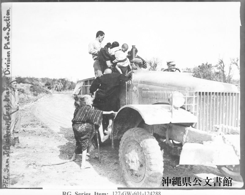 【和訳】 食糧や衣類、避難所を確保するため民間人収容所へ向かおうと、海兵隊トラックの周りに集まる地元沖縄人。戦場から一刻もはやく逃げられることに喜んでいる