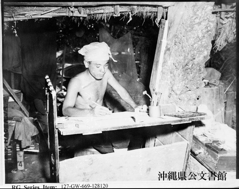 【和訳】 かつて沖縄防衛隊に従軍していた沖縄の芸術家・金城安太郎。彼は第6海兵師団に捕らえられたが、師団広報部の要請を受けて絵を描くために、収容所を出ることを許された。