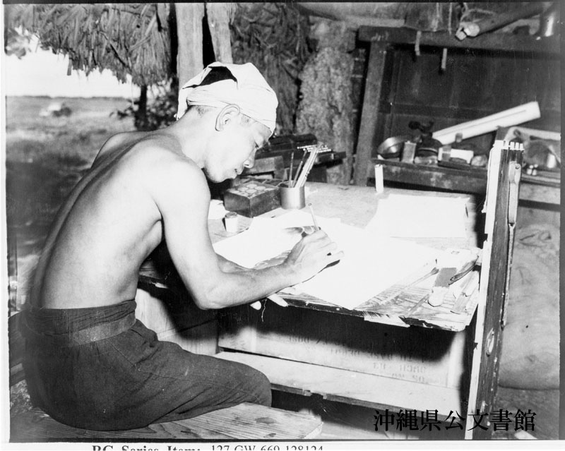 【和訳】 かつて沖縄防衛隊に従軍していた沖縄の芸術家・金城安太郎。彼は第6海兵師団に捕らえられたが、師団広報部の要請を受けて絵を描くために、収容所を出ることを許された。