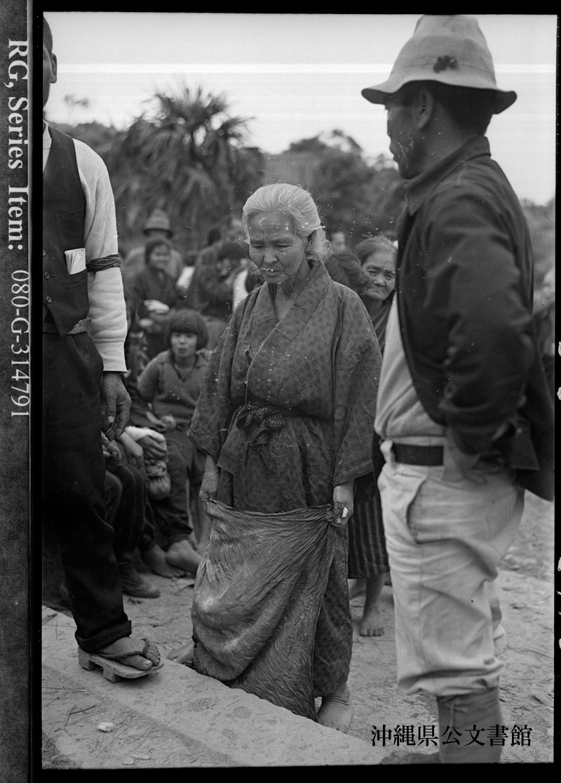 【和訳】 糧食を受け取る収容所の民間人。沖縄にて。