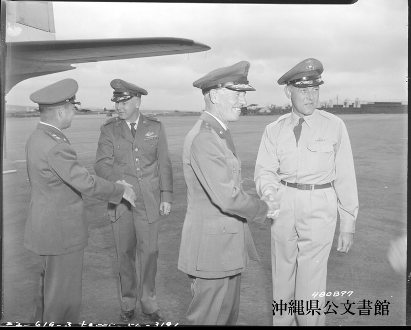 【和訳】 嘉手納基地到着の際に、オバリング大佐に迎えられるパークス将軍