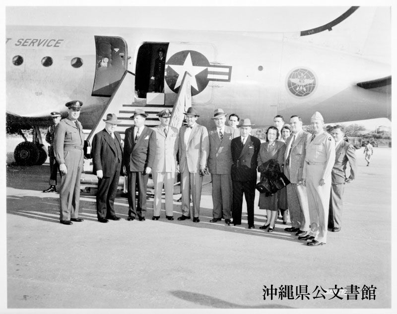 【和訳】 極東を視察中、嘉手納基地に立ち寄ったボナー下院議員(前列右から4番目)を団長とする軍事支出小委員会のメンバー。第20空軍司令官ステアリー少将(左から4番目)、琉球軍司令官ビートラー少将(右)の出迎えを受けた。