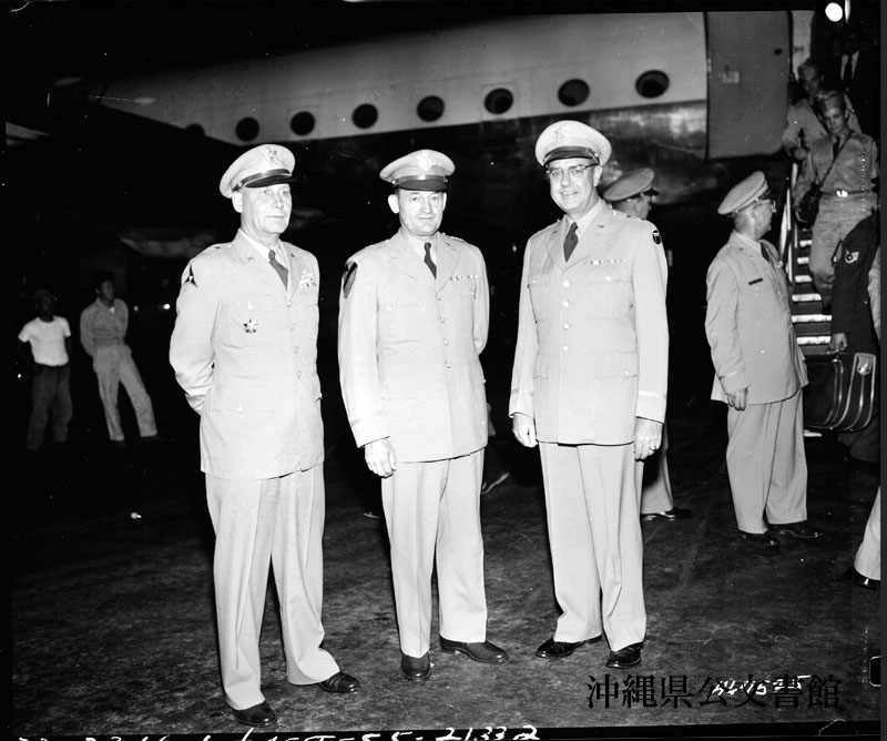 【和訳】 嘉手納基地に降り立った際、民政官バージャー准将とライカム司令官ムーア少将(右)に迎えられるUSAFFE第8軍副民政官バーマー中将(中央)
