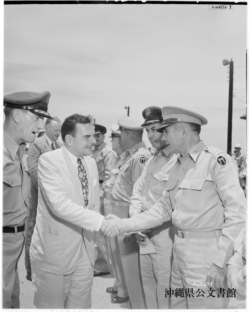 【和訳】 嘉手納空軍基地で琉球軍司令部参謀長コンクエスト大佐に迎えられるニューヨーク州知事トマス・デューイ氏。デューイ氏は東洋を視察中、陸空軍合同スタッフと兵士に紹介された。