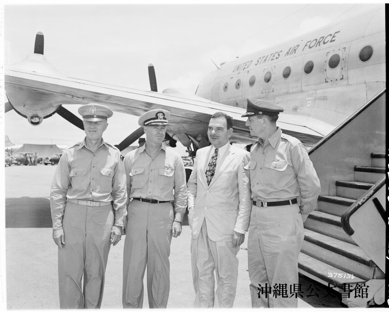 【和訳】 東洋視察中に嘉手納基地に立ち寄ったニューヨーク州知事トマス・デューイ氏。写真は左から琉球軍司令官シャーマン准将、米艦船コルソン号艦長フレージャー大佐、デューイ州知事、第20空軍司令官スターリー少将。