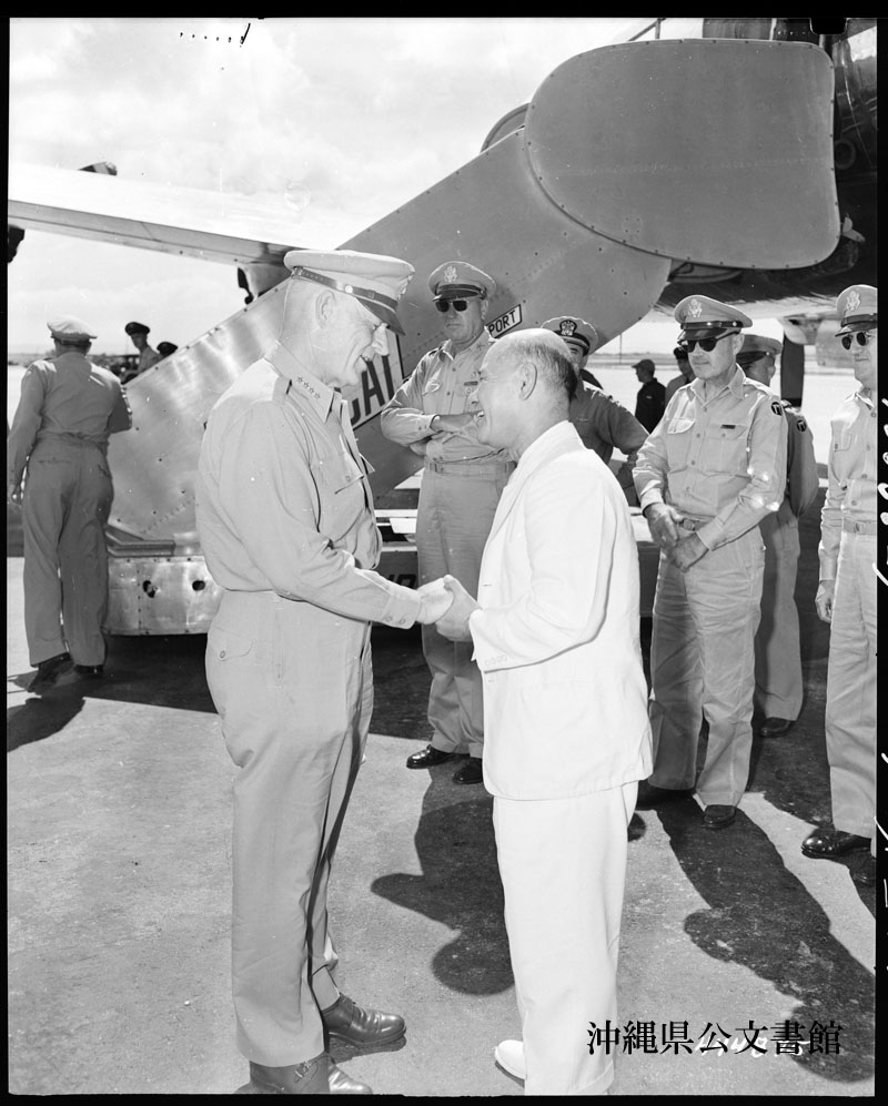 【和訳】 沖縄訪問を終え嘉手納基地から飛び立つ前、比嘉秀平琉球政府主席に別れの挨拶をする極東軍最高司令官ハル大将(左)