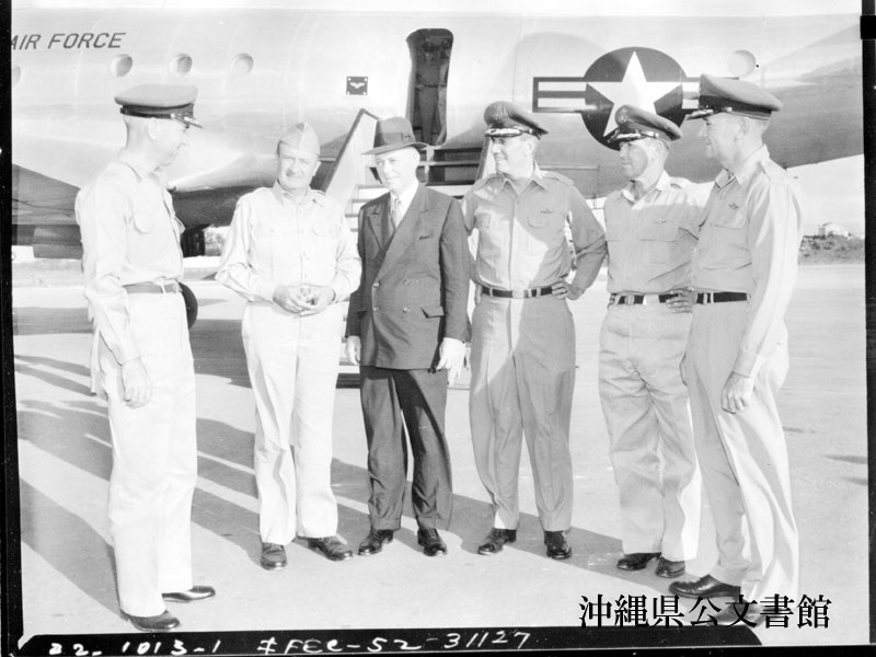 【和訳】 嘉手納基地で立っているのは(左から)指揮官スミス大佐、ライカム司令官ビートラー少将、空軍長官フィンレター氏、第20空軍司令官スターリー少将、USAFウェイカート少将、FEAFウィン准将の各氏