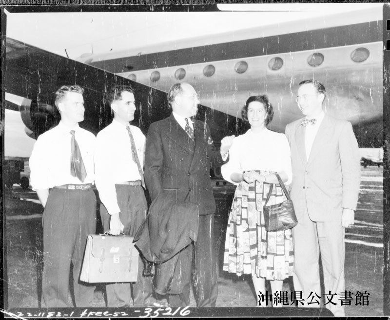 【和訳】 嘉手納基地に降り立った際、沖縄領事館のメンバーにむかえられる駐日米領事のビルチャー氏