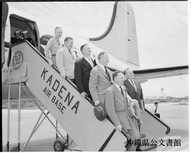 【和訳】 議会視察団。嘉手納基地を発つ沿岸警備小委員会のメンバー。上から陸軍省スプランクル氏、シエミンスキー下院議員、パスマン下院議員、キャンフィールド下院議員、ウィルソン下院議員。