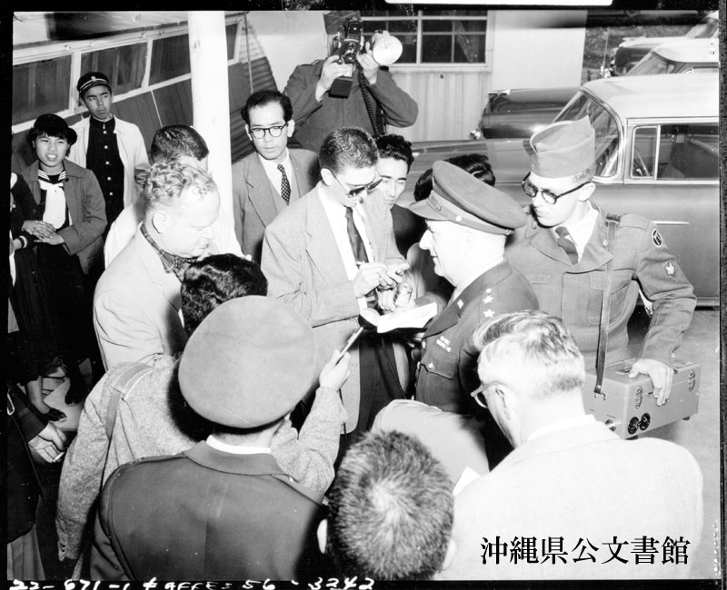 【和訳】 嘉手納基地を発つ前に、新聞やラジオのレポーターからインタビューを受けるゲイリー将軍