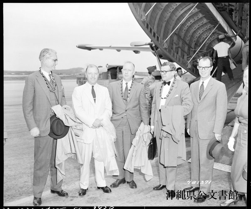 【和訳】 沖縄視察の前に、嘉手納基地に降り立った在日米大使館の国務省職員を出迎えるライカム第9軍副司令官ジョンソン准将(右)。写真は左から政治担当ラム氏、政治問題顧問モーガン氏、海外援助顧問ワーリング氏、沖縄領事スティーブス氏、米領事館セイブ氏、ジョンソン准将