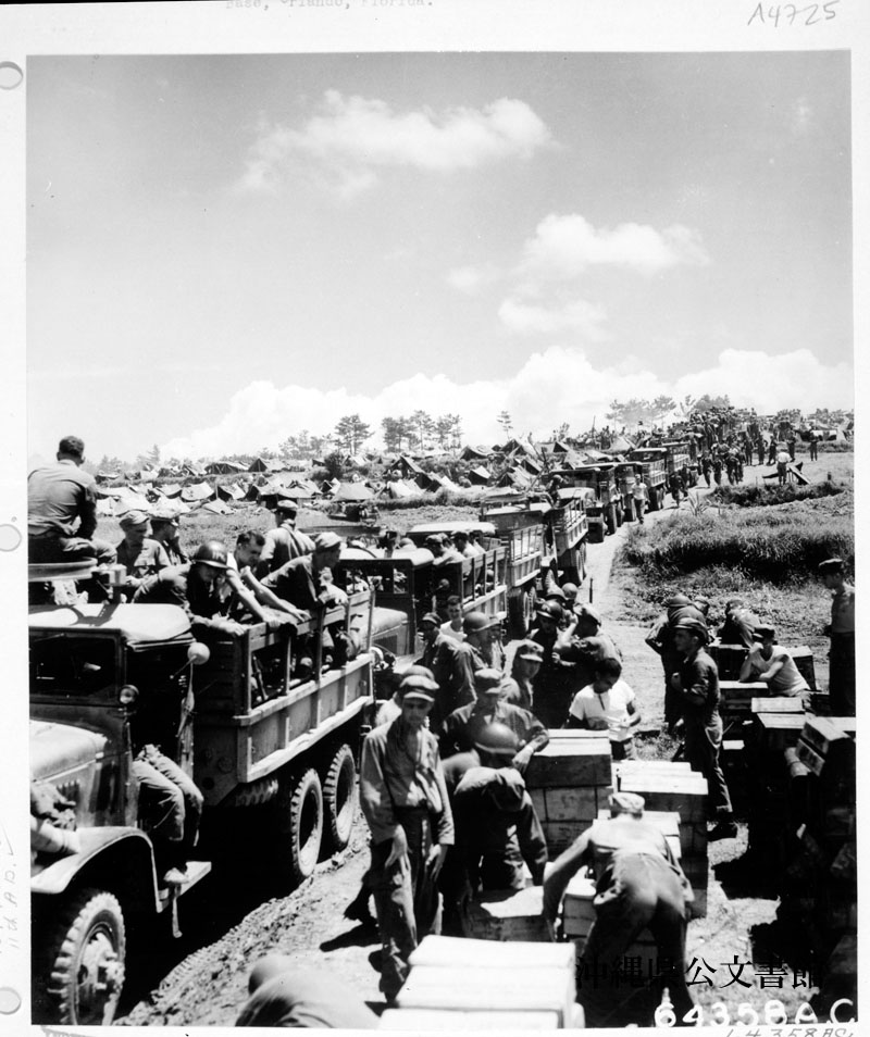 【和訳】 ダグラスC-54に乗るため、嘉手納飛行場の野営地でトラックに乗り込む第11空挺師団第187パラグライダー連隊の兵士。