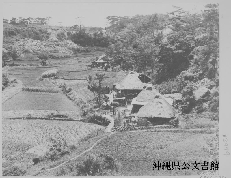 【和訳】 沖縄本島北部嘉手納空軍基地近くの小さな村に見られる農地と藁葺き屋根。