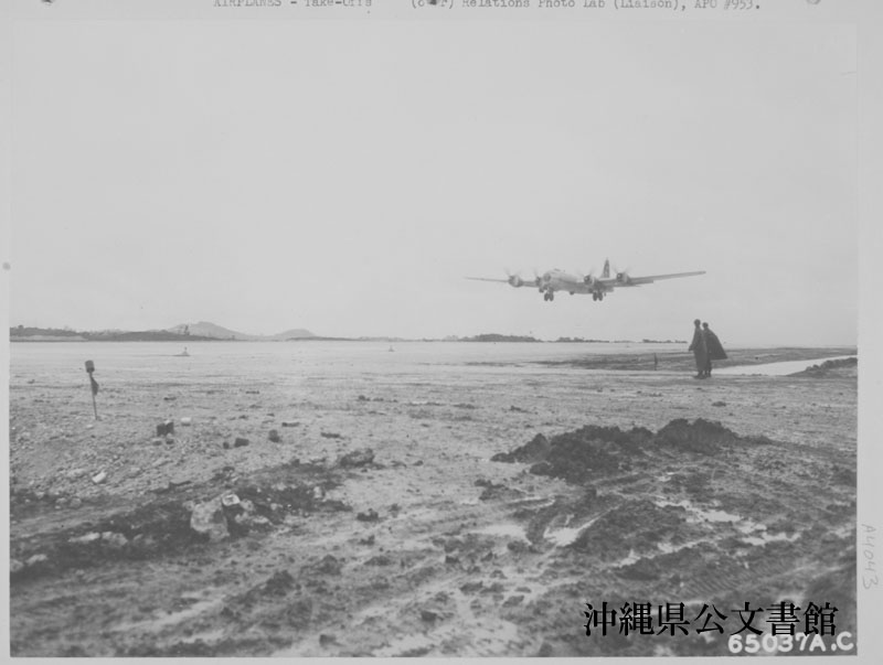 【和訳】 嘉手納飛行場の5,000フィートの滑走路から離陸する最初のボーイングB-29スーパーフォートレス。