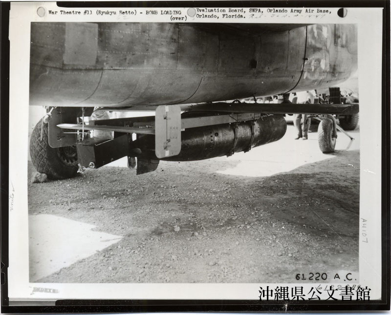 【和訳】 後方よりとらえた第47爆撃中隊第41爆撃群所属のノース・アメリカンB-25ミッチェルに取り付けられたMK-13敷設魚雷。嘉手納飛行場。
