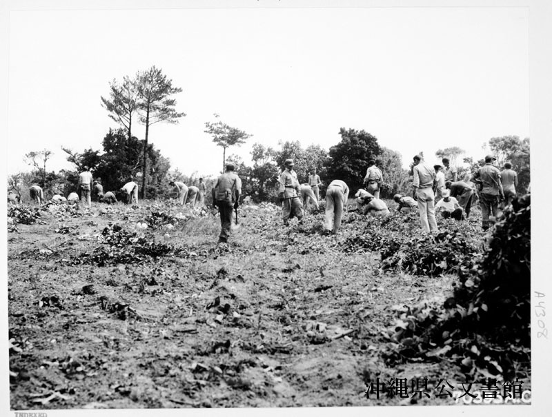 【和訳】 嘉手納飛行場近く、キャンプ設営前に臨時キャンプ場を片づける第41爆撃群の兵士。