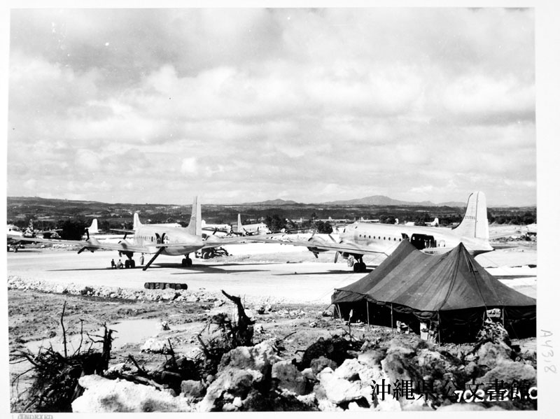 【和訳】 嘉手納飛行場内の舗装広場に並ぶダグラスC-54は滑走準備が整っている。第13空輸補給中隊のこれらの輸送機にとって知らない国は日本を残すのみとなっている。
