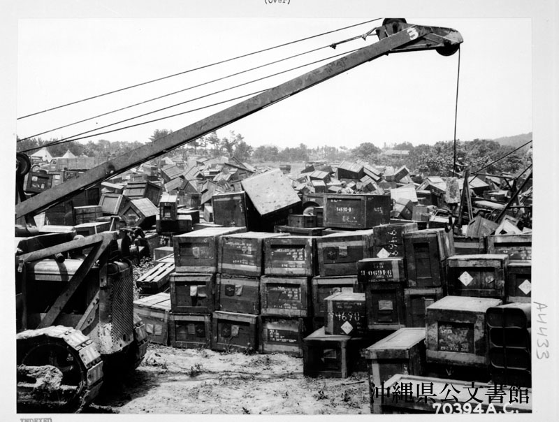【和訳】 嘉手納飛行場近くにある第41爆撃群の臨時集積所に積まれる補給物資。沖縄。