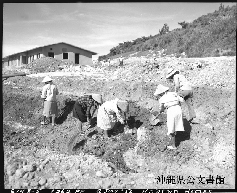 【和訳】 嘉手納空軍基地。新しい住宅への水道管敷設のため、みぞを掘る地元の女性たち。