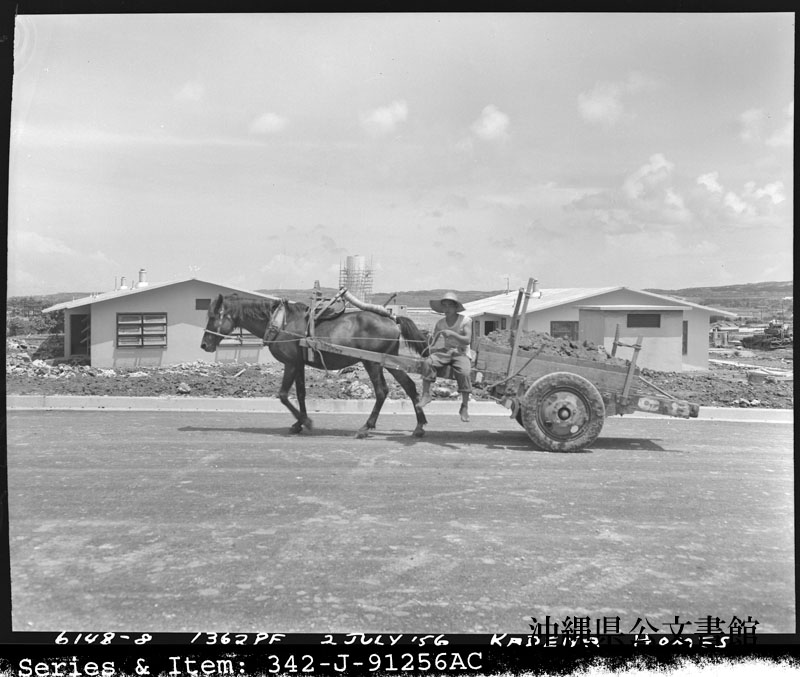 【和訳】 嘉手納空軍基地。新築住宅の芝生用の土を荷車で運ぶ地元労働者。