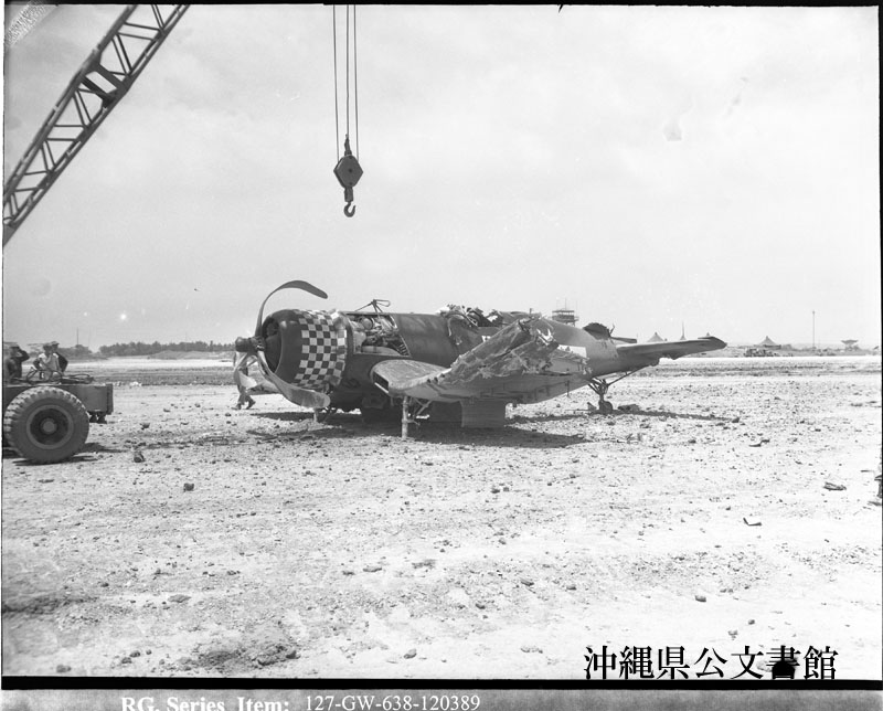 【和訳】 嘉手納飛行場から離陸の際に破壊されたコルセア戦闘機。