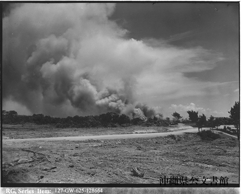 【和訳】 嘉手納飛行場近くの弾薬集積所が轟音を立てて炎上している。1945年7月5日から6日にかけて16時間にも及んだ砲爆撃で、この島の南端部は壊滅した