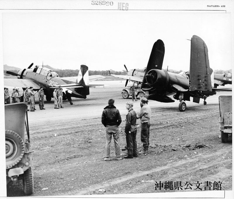 【和訳】 指令のため嘉手納飛行場に降り立った第83魚雷中隊指揮官スチュワート海軍少佐とTBF、F4U操縦士と乗組員