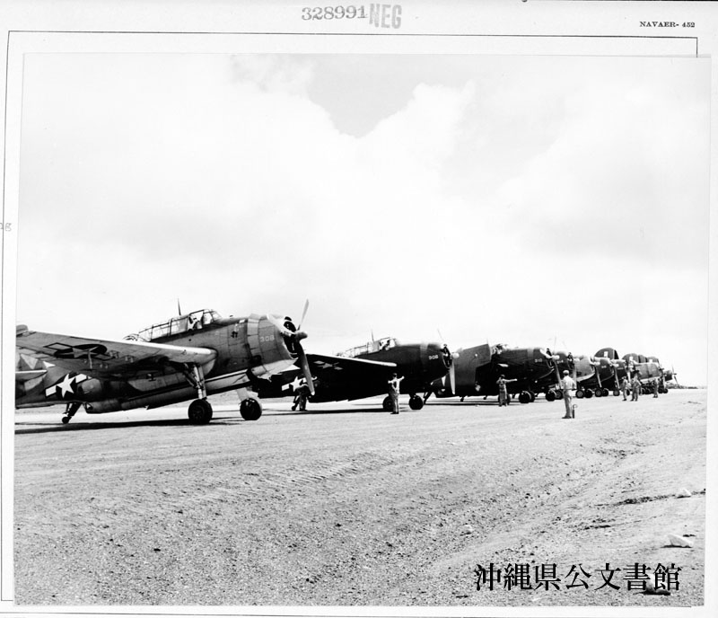 【和訳】 指令のため嘉手納飛行場に降り立った第83魚雷中隊指揮官スチュワート海軍少佐とTBF、F4U操縦士と乗組員
