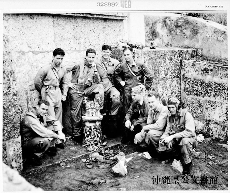 【和訳】 嘉手納飛行場近くの墓の前でたたずむ第83飛行部隊の将校達。左からレヴェレン中尉、バラーモ中尉、ウッド中尉、シャムウェイ中尉、スリーペック中尉、スチュワート少佐、ピアース中尉、ストラウス少尉。
