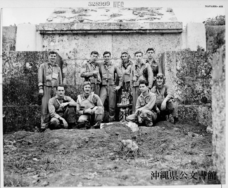 【和訳】 嘉手納飛行場の墓地の前でたたずむ第83魚雷中隊の乗組員