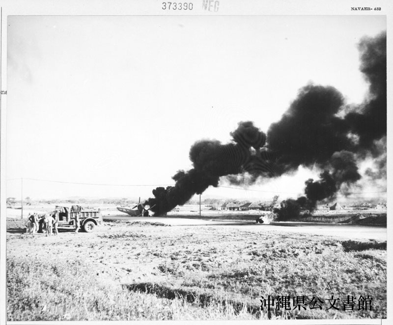 【和訳】 地上から発射されたナパーム弾により炎上、嘉手納飛行場に墜落したF4Uコーセアー号