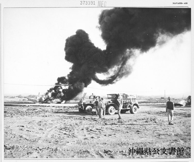 【和訳】 地上から発射されたナパーム弾により炎上、嘉手納飛行場に墜落したF5Uコーセアー号
