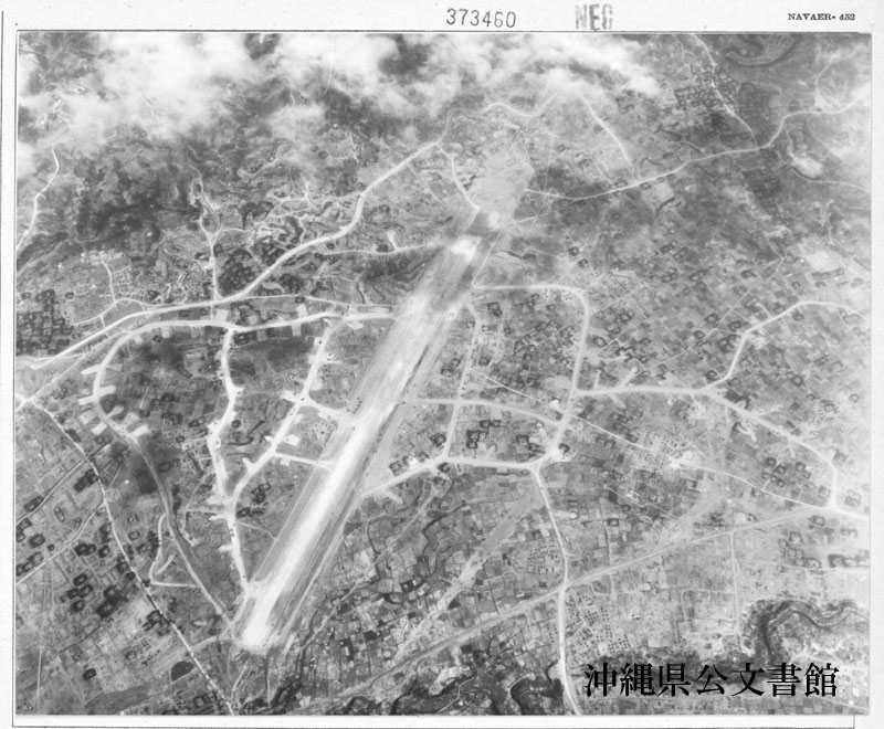 【和訳】 嘉手納飛行場滑走路とその周辺の航空写真