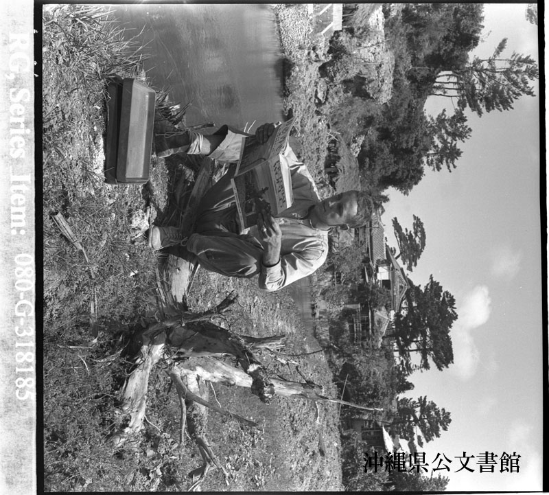 【和訳】 マクベイ海軍衛生兵長が、雑誌“Pictorial World”(邦題「世界画報」)に目を通している様子。同誌のタイトルは英語であるが、中身は全て日本語で書かれている。嘉手納近くの比謝川にて。