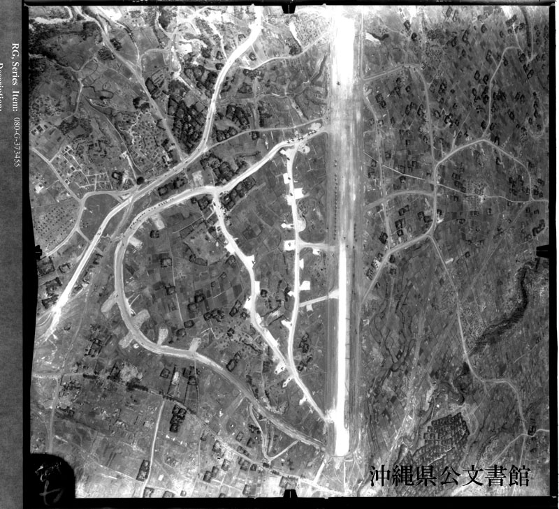 【和訳】 嘉手納飛行場と周辺地域の空中写真。