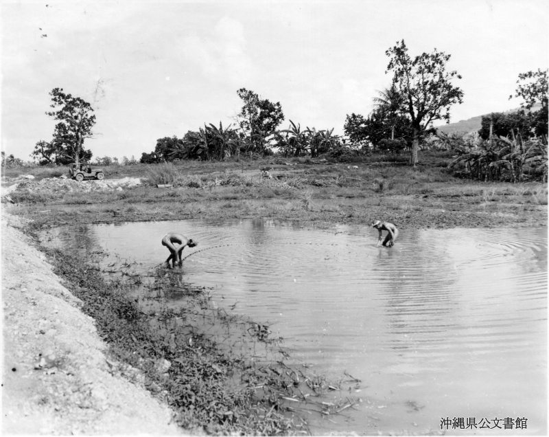 【和訳】 多くの地元民がサイパン人の基幹産業であった漁業に再び精を出している。この二人は農地の近くの雨でできた湖で釣りの餌を探している。魚と農地から採れる作物で地元民が自給自足するようになることが期待されている。