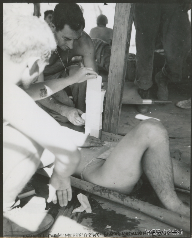 【和訳】 サイパンの海岸沿いの病院で、ふんどし姿の腕を折った日本人捕虜に処置を行う海軍医療隊員。