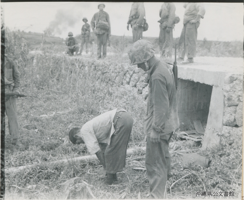 【和訳】 右側の排水溝で捕らえられた日本人捕虜が靴ひもを結ぶために屈む。