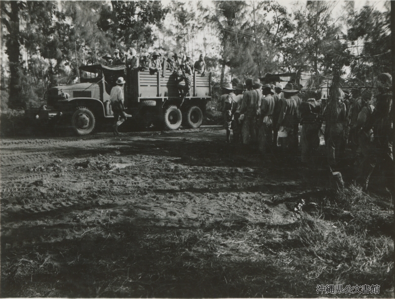 【和訳】 民生部 - 労働部隊の出動。米軍がサイパンを占領し、瓦礫を片づける作業のため、キャンプを出て海兵隊のトラックに乗る捕虜たち。彼らには米軍から報酬が支払われる。