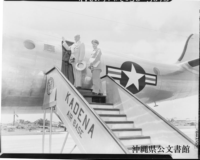 【和訳】 東京への出発を前に嘉手納空軍基地で飛行機に乗り込むジョンソン国防長官(左)と統合参謀本部議長ブラッドリー将軍。両氏は極東の軍事施設の視察で沖縄を訪れた。